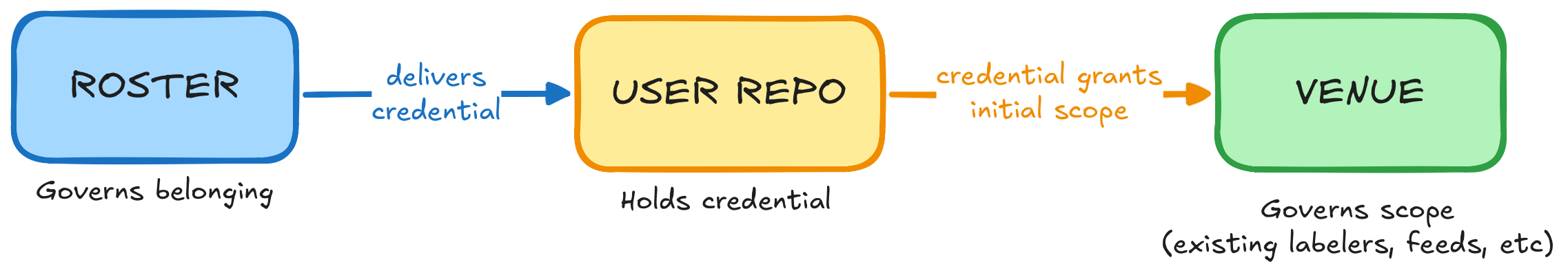 This analysis gives us two primitives to work with. One primitive — let’s call it a Roster — issues credentials. It defines the community, decides who meets the community’s criteria, and manages vetting. The other primitive — call it a Venue — is any service that scopes to and interprets the Roster’s credentials. It governs its own service’s context, and decides if, how, and when to interpret the Roster’s credentials.
